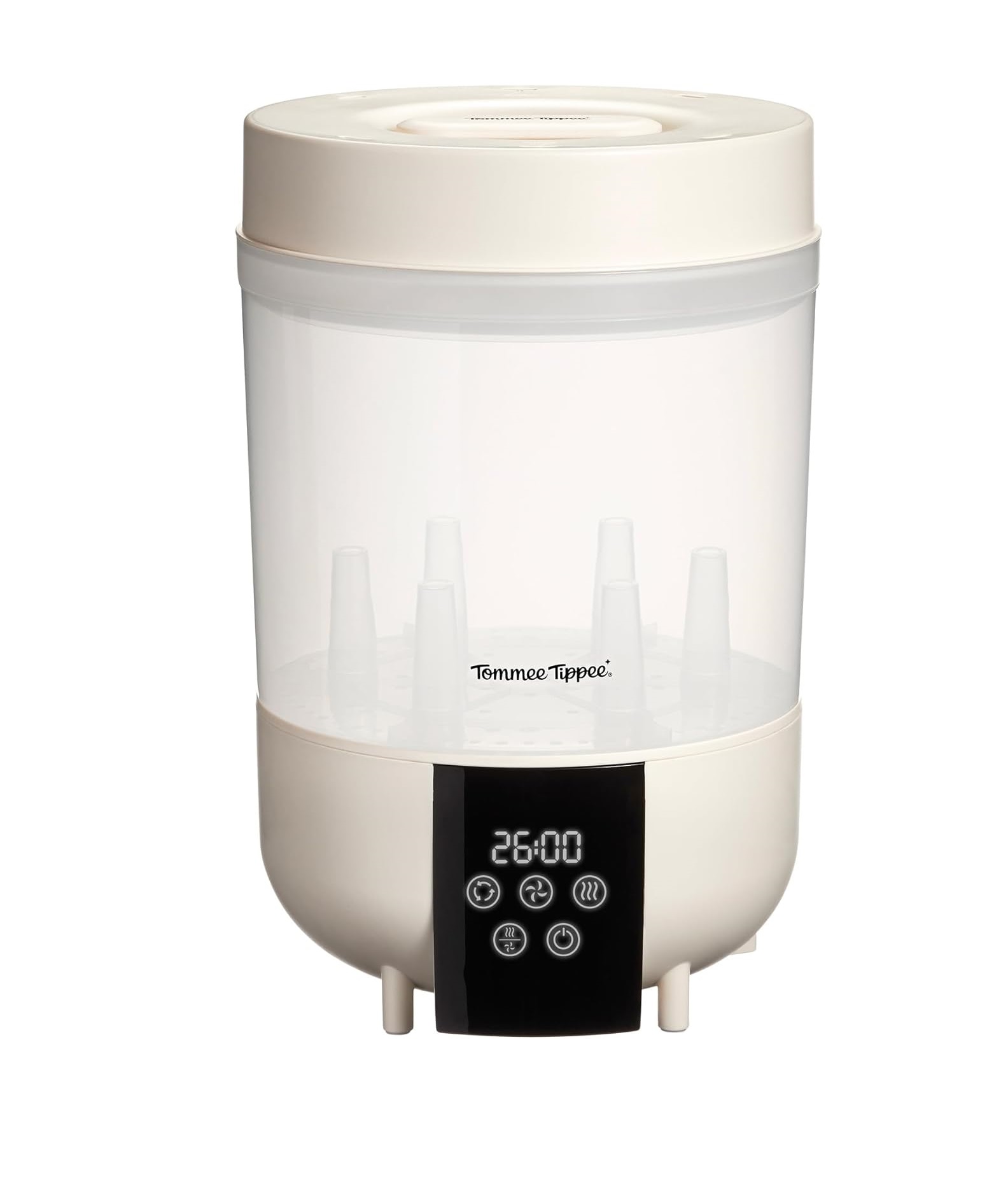 - Circular design: New round shape means air can circulate more effectively when drying, and the small stands are removable, for even more space inside.The QuickDry steriliser uses 100% natural steam to sterilise and dry six bottles in 26 minutes†. With 4 modes to choose from, and a sleek new design to suit your space, we’ve got you. • 100% natural steam kills viruses and 99.9% of bacteria** • Sterilises and dries 6 bottles in 26 minutes† • 4 modes to choose: Sterilise, Dry, Sterilise and Dry, and Auto • Comes with 2 HEPA filters to remove airborne dust and dirt • Sleek new design suits your space †Based on 260ml Tommee Tippee bottles using the auto quick sterilise and dry cycle time. Does not include the 40 seconds pause between sterilisation and drying, and the cool down time. **Tested to EN 16777 and against influenza H1N1 ***When the sterilising cycle is finished, leave the lid closed and the contents will remain sterile for up to 24 hours.
